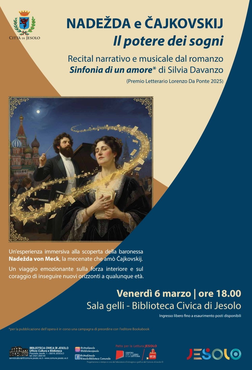 Biblioteca Civica di Jesolo (VE) RECITAL NARRATIVO E MUSICALE 6 marzo 2026 ore 18.00 Biblioteca Civica di Jesolo NADEŽDA e ČAJKOVSKIJ Il potere dei sogni Recital immersivo tra letteratura, musica e ispirazione basato sul romanzo "Sinfonia di un amore" di Silvia Davanzo, terzo classificato al Premio Letterario "Lorenzo da Ponte" di Treviso 2025. ​Tra letture recitate tratte dall’opera e inserti musicali, l’autrice condurrà il pubblico alla scoperta della straordinaria figura della baronessa russa Nadežda von Meck, la mecenate visionaria che amò e sostenne la fioritura artistica di Čajkovskij attraverso un legame epistolare unico. La presentazione editoriale esplorerà i temi dell’amore, dell’arte e della forza femminile, intrecciandosi a riflessioni motivazionali su come trasformare la paura di fallire nel coraggio di realizzare i propri sogni a qualsiasi età. L’incontro si concluderà con un invito a riscoprire il ruolo attivo del lettore nel dare vita a nuove storie, diventando parte integrante del viaggio editoriale del romanzo attraverso l’innovativo modello dell'editore Bookabook. ​L’evento è gratuito e aperto a tutti i cuori ancora capaci di emozionarsi. ​È gradita la prenotazione per assicurarvi in omaggio la vostra busta personalizzata. Info e prenotazioni: 3299809774