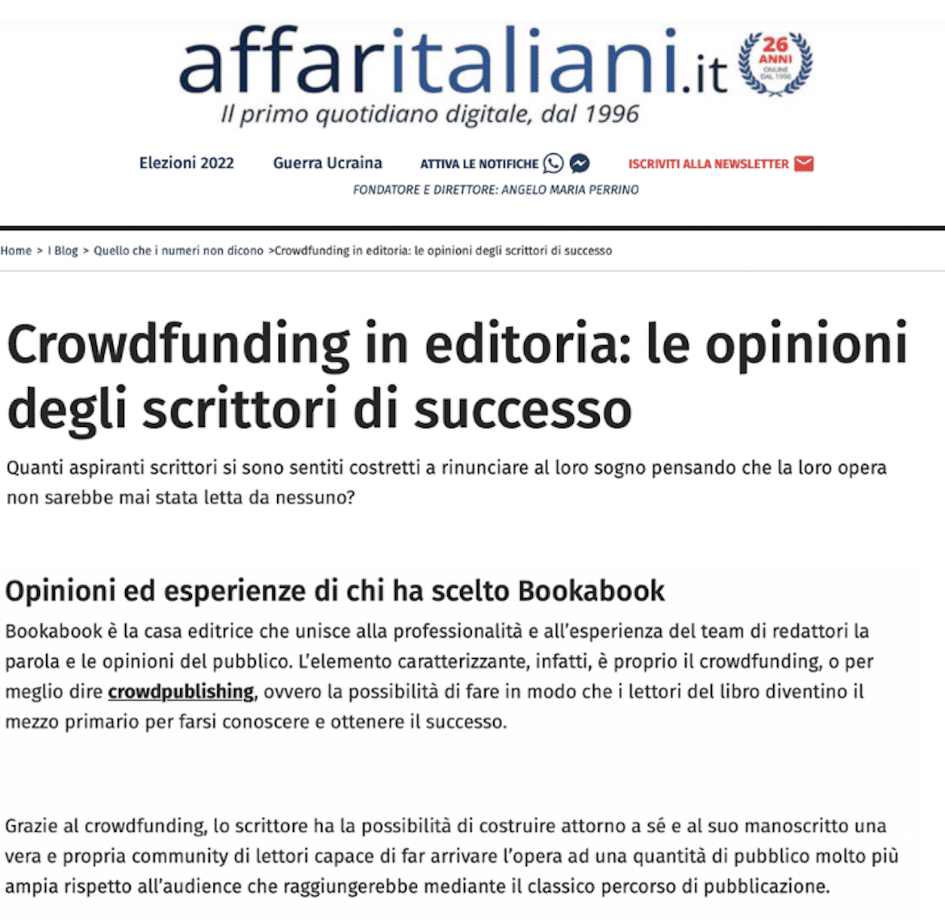 Oggi su Affari Italiani si parla di crowdfunding in editoria, di bookabook e dei suoi casi di successo. L’articolo completo con le opinioni di alcuni autori e autrici, le cui esperienze con Bookabook confermano la potenza del crowdfunding, è disponibile qui.