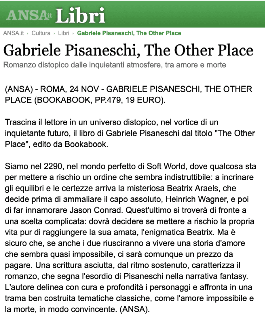 Oggi su Ansa Libri si parla di The Other Place, il romanzo distopico di Gabriele Pisaneschi. Qui l’articolo completo.