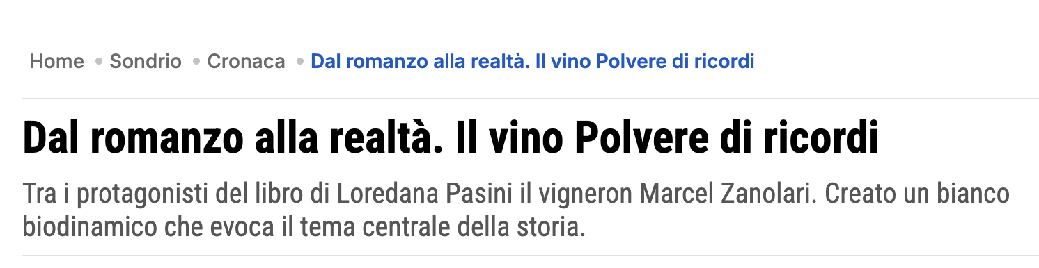 Dal romanzo alla realtà. Il vino Polvere di ricordi. Tra i protagonisti del libro di Loredana Pasini il vigneron Marcel Zanolari. Creato un bianco biodinamico che evoca il tema centrale della storia. Loredana Pasini lo ha messo tra i protagonisti del suo “Arlene Della Morte – Ricordi di polvere“ (Bookabook) e Marcel Zanolari, che nel romanzo fa esattamente ciò che fa nella vita, per prolungare l’esperienza ha voluto creare “Polvere di ricordi“, un vino che fosse una sorta di estensione della narrazione.